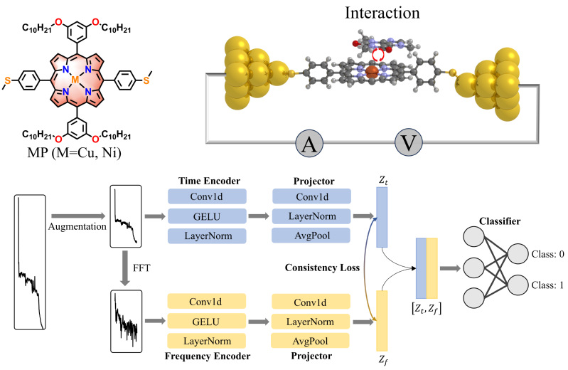 (上)代表性卟啉分子合成及STM-BJ(Copyright by Pilab)(下)基于时频融合的多特征深度学习模型