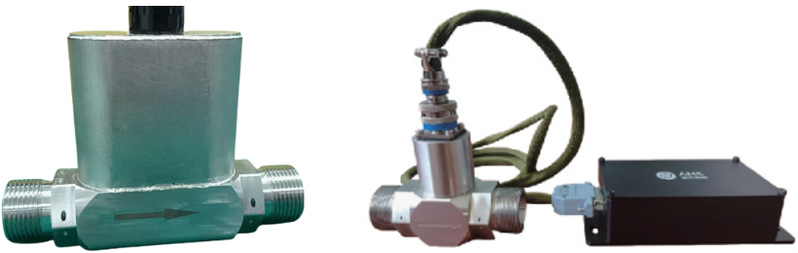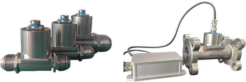 a. 双涡轮流量传感器(无人机用) b. 对转涡轮流量传感器(火箭用)