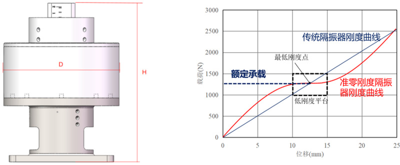 团队与中船集团等单位合作,研制了准零刚度隔振器,刚度具有高静低动特性,静态承载时具有高刚度特性以稳定支撑负载;动态响应时则呈现超低动刚度特性,从而实现超低频段的高效隔振与抗冲击性能,目前产品最低有效隔振频率可低至1Hz。